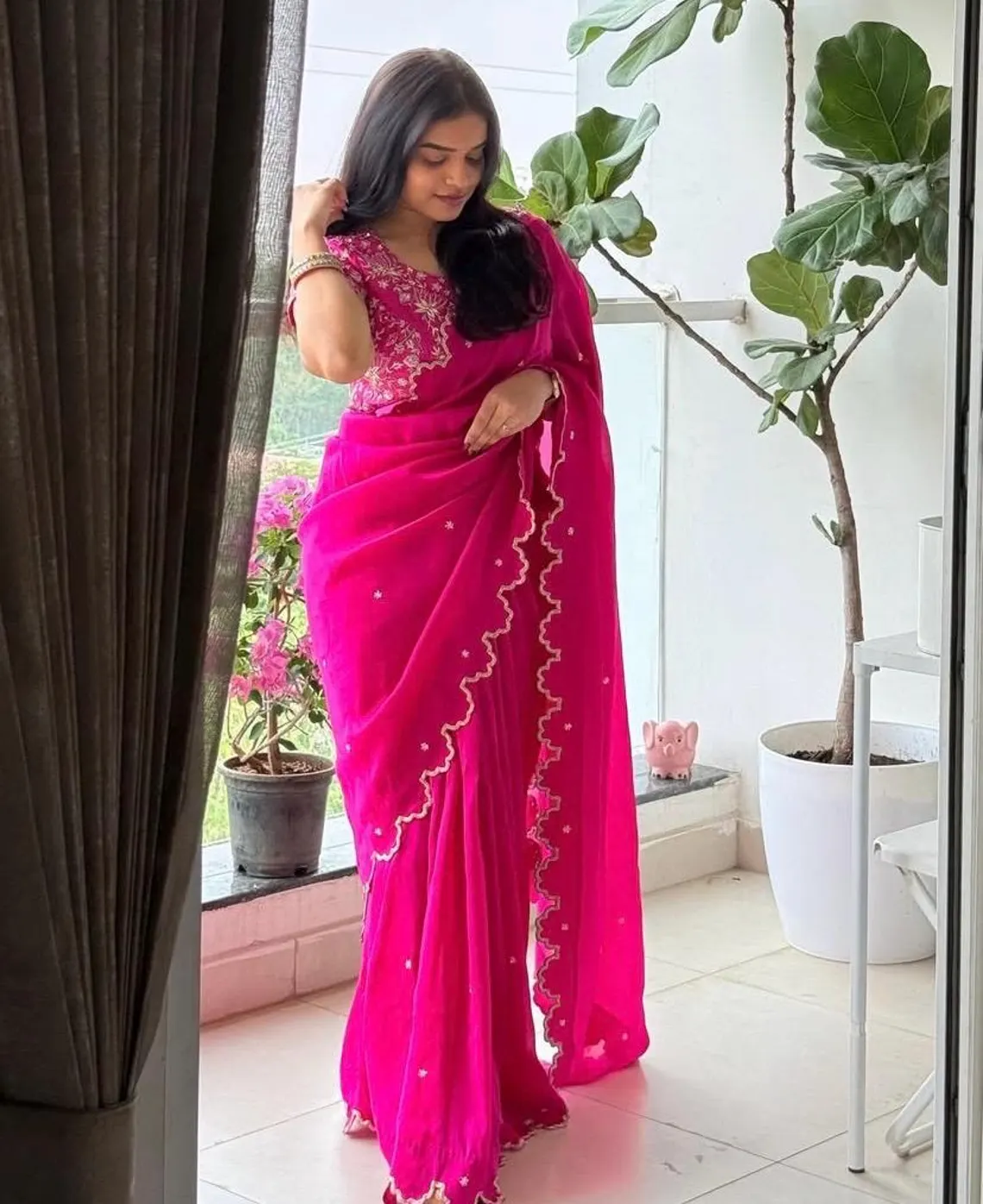 Its a beautiful simple hand embroidery chiffon silk saree in pink color with hand embroidery scallop border all over paired with self pink color heavy all over maggam work blouse as shown !!! It’s light weight, soft and Comes with U neck hand embroidered stitched blouse as shown in picture and reasonably priced !!!