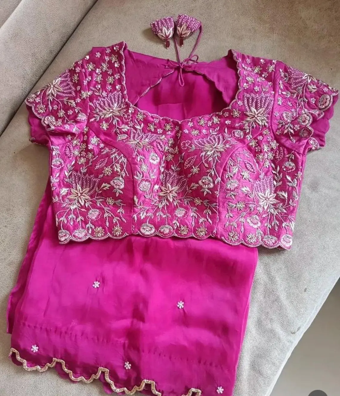 pink hand embroidery satin Chiffon silk saree with hand embroidery blouse |modern silk saree with readymade blouse | sarees USA | pure light weight silk saree / hot pink saree with heavy embroidered stitched blouse / voggish / elbow sleeve maggam blouse